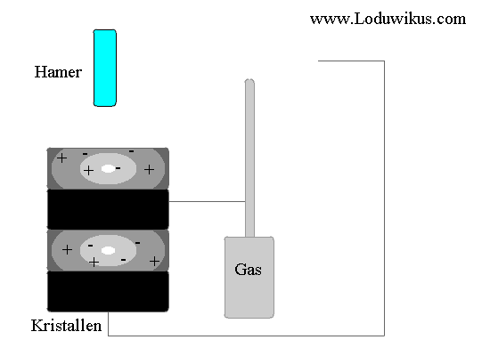 Het piëzo-elektrisch effect dat gebruikt wordt om een elektrische ontlading te bewerkstelligen komt door het gebruik van piëzokristallen. Deze kristallen hebben een geordende regelmaat in de kristalstructuur zitten van plus- en min-ionen. De plaats van deze plus- en min-ionen houden het kristal neutraal. Door dit kristal te vervormen verandert de plaats van deze ionen waardoor er een verschil van lading ontstaat in het kristal. Als het kristal weer in zijn oorspronkelijke vorm terugspringt zal het potentiaal verschil in het kristal zich ontladen tot een elektrische stroom. Door een aantal van deze kristallen op elkaar te stapelen zal de spanning van de ontlading hoger zijn. Door hard op de kristallen te tikken vervormen de kristallen en komt er een stroomstoot vrij. Dit is een nagenoeg oneindig proces, de kristallen blijven bij deze ontlading intact. Door er opnieuw op te tikken zal er weer een stroomstoot vrij komen.